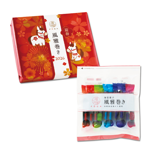 風雅巻きの人気の5種類10本を箱に詰め、かわいらしい干支の包装紙で包装しました。
