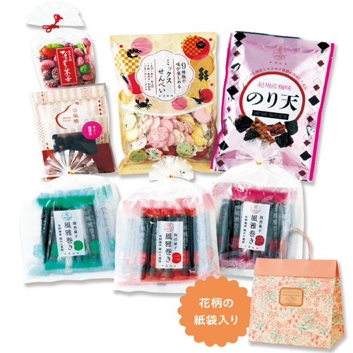 風雅巻き ・醤油大豆(7本) ・醤油カシューナッツ(5本) ・醤油ピスタチオ(5本) ・豆風情 ビター珈琲豆(45g) ・のり天<梅味>(55g) ・九種ミックスせんべい(80g) ・四季の花<砂糖がけビスケット>(160g) [オンラインショップ掲載期間] 4月1日~5月20日までの販売となります。 |