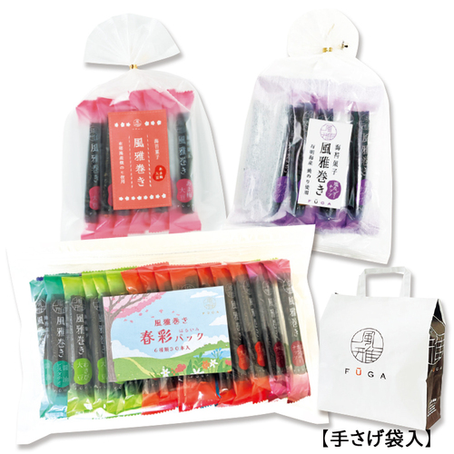 春彩パック ・醤油大豆(7本) ・醤油ピーナッツ(7本) ・わさび大豆(6本) ・塩ピーナッツ(6本) ・醤油カシューナッツ(2本) ・醤油ピスタチオ(2本) 風雅巻き小袋 ・あま梅大豆(6本) ・塩カシューナッツ(5本) 9種類合計41本 [オンラインショップ掲載期間] 4月13日~5月20日までの販売となります。 |