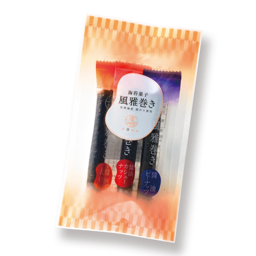 風雅巻きの中でも定番で、特に人気の3種類を1本ずつ袋に詰めました。 風雅巻きのお味見パックとして、ちょっとしたプレゼントやお土産として、会合やイベントの粗品など、様々な場面でご利用いただけます。