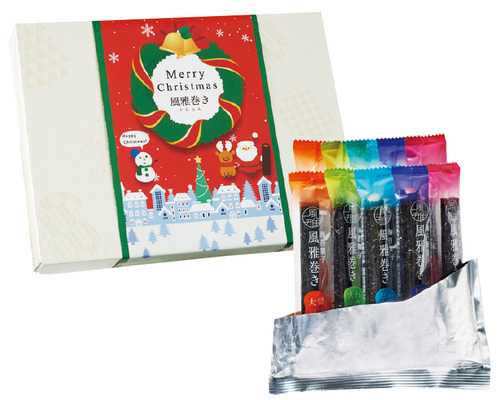 風雅巻き人気の5種類10本を箱に入れ、クリスマスの帯を巻きました。