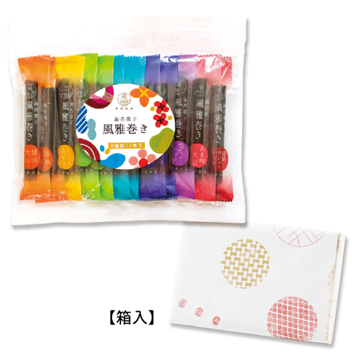 8種類の風雅巻きを合計12本詰めた、カラフルなパッケージが目を引く、限定の特別詰合せです。